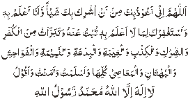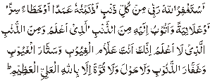 Astaghfir-ul-Allah Rabbi min kulle zanbin aznabtuhu amadin auo khata-an sirran auo alaaniyatan wa atubu ilayhi min alzanb illazi aalamu wa min alzanbillazi la aalamu innaka anta allamul ghuyub wa sattarul ayyub wa ghaffarul zunub wa la haula wa la quwwata ila billah – il – aaleeyyil Azeem. I seek forgiveness of Allah for every sin which I committed willfully or unwillfully, secretly or openly. And I turn to Him for the sin which I know and which I know not. (My Lord!) You certainly know the things unseen, You hide the sins and You are forgiver of sins. there is no power or ability (to do good or evil) except with help of Allah Who is the most High and Supreme. 6) Sixth Kalimah: It is called Kalimah Radde Kufr, which means word for rejection of Disbelief. With this Kalimah, a believer gets rid of disbelief and polytheism. It is as follows: