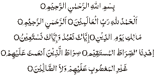 Alhamdu lil-lahi rab-bil ‘alameen. Ar Rahman-ir-Raheem. Maliki yaumid-Deen. Iyyaka na’budu wa iyyaka nasta’een. Ihdinas-Siratal mustaqeem. Siratal ladheena an’amta ‘alyhim. Ghayril maghdubi ‘alayhim waladhdhal-leen. ‘Ameen. All praise (and Thanks) be to Allah, the Lord of the Universe. The Most Kind, the Most Merciful. The Master of the Day of Judgment. (Our Lord!) You alone we worship and You alone we ask for help. Guide us to the right path. The path of those on whom You have showered Your favours. Not (the path) of those who earned Your anger, nor of those who went astray. (Al-Qur’an: Surah 1)