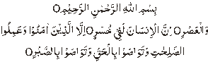 Bismillahir-Rahmaanir-Rahiim. Wal-‘Asri. Innal-‘Insaana lafii khusri. ‘Illallaziina ‘aamanuu wa ‘amilus-saalihaati wa tawaasaw bil-Haqqi wa tawaasaw-bis-Sabr. In the name of Allah, the Beneficent, The Merciful. By the declining day. Lo! Man is in a state of loss. Save those who believe and do good works, and exhort one another to truth and exhort one another to endurance. (Al-Qur’an: Surah 103)