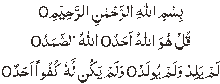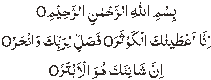 Bismillahir-Rahmaanir-Rahiim. ‘Innaaa ‘a’-taynaakal-Kawsar. Fa-salli li-rabbika wanhar. ‘Inna shaani-‘aka huwal-‘abtar. In the name of Allah, the Beneficent, The Merciful. Lo! We have given thee Abundance. So pray unto thy Lord and offer sacrifice. Lo! It is thy insulter (and not thou) who is without posterity. (Al-Qur’an: Surah 108)