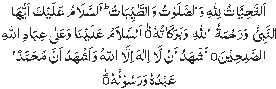 At-tahiyyatu lillahi was salawaatu wattayyibaatu, As-salaamu alayka ayyuhan-nabiyyu wa-rahmatu-llahi wa-barakaatuhu, As-salaamu alaynaa wa-ala ibaad ilaahis saaliheen. Ash-hadu an-laa Ilaaha ill Allahu wa ash-hadu anna Muhammadan abduhu wa-rasooluhu. All greetings, prayers, and good things of life are for Allah. The peace and mercy and blessings of Allah be on you, oh Prophet, May peace by upon us and on righteous servants of Allah. I bear witness that there is no god but Allah, and I bear witness that Muhammad is His servant and Messenger. When you are saying Ash-hadu alla illaaha ill-Allahu……, you should raise your index finger of right hand slightly and return it to its previous position after you have finished saying it. If your are performing prayer of two Rakaahs, only then you should recite the following supplication (Darud called Darud-e-Ibrahim) upon the Prophet in this Qaadah: