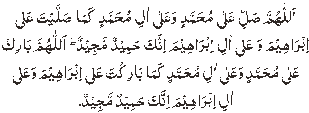 Allahumma salli ‘ala Muhammadin wa’alaa aali Muhammadin kama sallayta alaa Ibraheema wa alaa aali Ibraaheema Innaka Hameedum Majeed. Allahumma baarik alaa Muhammadin wa alaa aali Muhammadin kamaa barrakta alaa Ibraheema wa alaa aali Ibraaheema Innaka Hameedum Majeed. O Allah! Send Your Mercy upon Muhammad and upon family of Muhammad as You sent Your Mercy upon Ibrahim and upon Family of Ibrahim, certainly You are the Most Praiseworthy and Most Glorious. O Allah! Send Your blessings on Muhammad and Muhammad’s family as You sent Your Blessings on Ibrahim and on Ibrahim’s family, certainly You are the Most Praiseworthy, the Most Glorious. After reciting the above supplication, recite either of the following two supplications: