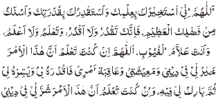 Subhan-Allah wal Hamdu lillahi wa la ilaha ill-Allahu wa-Allahu akbar. Glory be to Allah and all praise is due to Allah. There is no god except Allah, and Allah is the Most Great. The procedure in brief of this prayer is as under: In the first Rakaah, recite the above Tasbeeh 15 times after recitation of al-Fatihah and passage of Quran, then go to Ruku and repeat this Tasbeeh 10 times, then stand up in Qawmah and repeat this Tasbeeh 10 times, then go to Sajdah and repeat this Tasbeeh 10 times, then rise from Sajdah and sit in Jalsah and repeat this Tasbeeh 10 times, then go to second Sajdah and repeat it 10 times and then in Jalsah Ishtrahat repeat it ten times. It makes 75 times in the first Rakaah. Repeat it 75 times in second, third and fourth Rakaah, in second and fourth Rakaahs offer this Tasbeeh in Qaadah 10 times instead of Jalsah Istrahat. 7. Salatul Istikhara Istikhara means to seek welfare or pray for goodness. When a person wants to do a thing but is undecided whether he should do it or not, or when he is unable to decide between two alternatives regarding some important thing, he should seek help of Allah and Allah’s guidance in such situations. He should offer two Rakaahs of Nafl prayer, glorify Allah, send Darud on the Prophet and then read the following Dua: